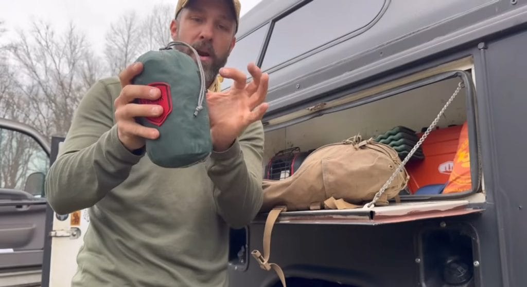 I keep a cinch pack from PNW Bushcraft (I designed this pack and they make them for me) for extra warming layers. It's wax canvas, nearly waterproof, not completely waterproof but pretty close. I keep wool scarves, extra bandanas, gloves, hats, and extra socks in there. If I need something, I pull from it. But for the most part I use it as a pillow at night, which is really nice.